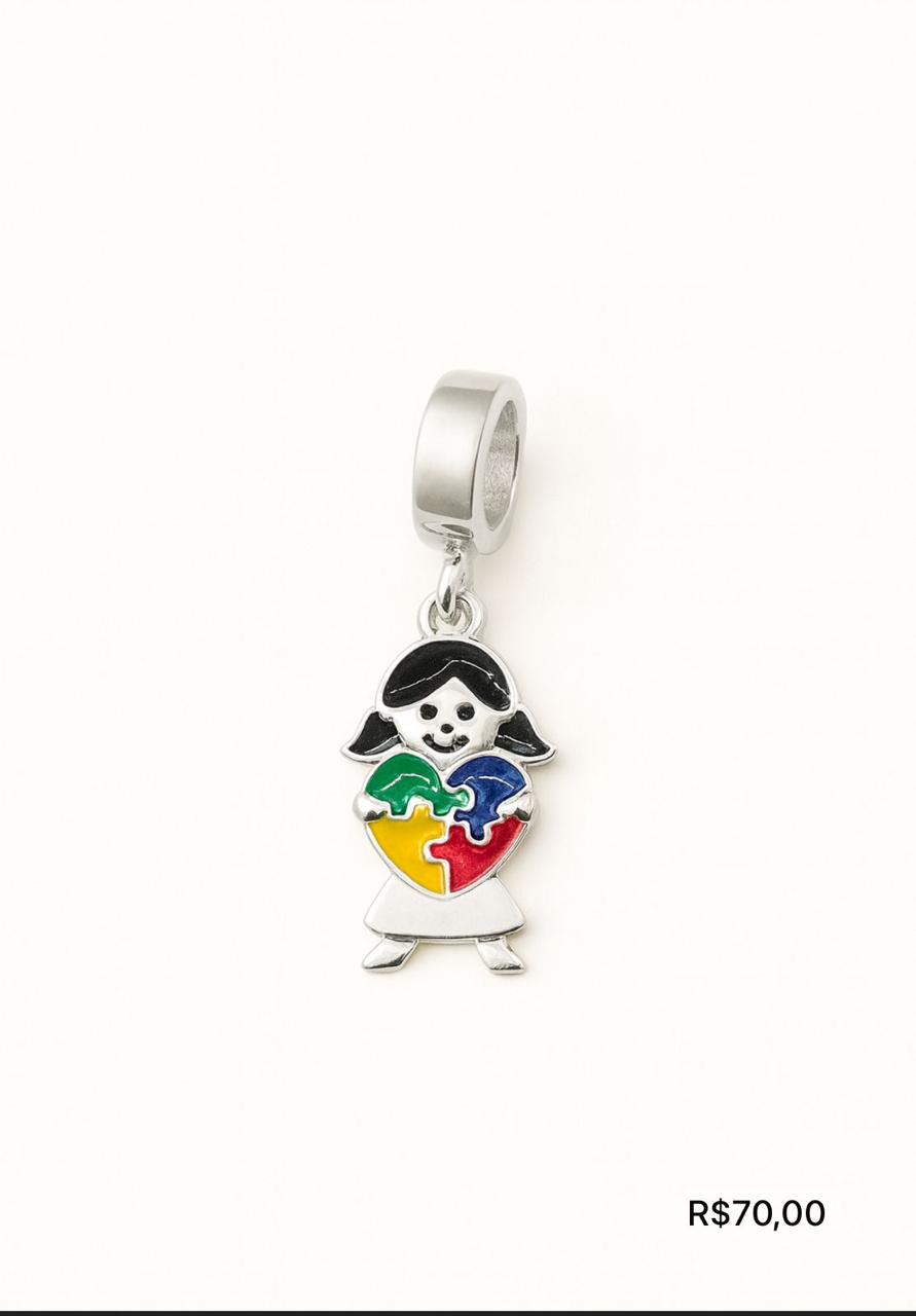 Berloque de menina em prata 925 com símbolo do autismo, perfeito para quem busca uma joia que une delicadeza e significado. Este berloque exclusivo destaca o coração formado por peças de quebra-cabeça coloridas, símbolo mundial do autismo, transmitindo apoio e conscientização de forma elegante. Feito em prata 925, garante alta durabilidade e brilho intenso, ideal para compor pulseiras e colares com personalidade.
